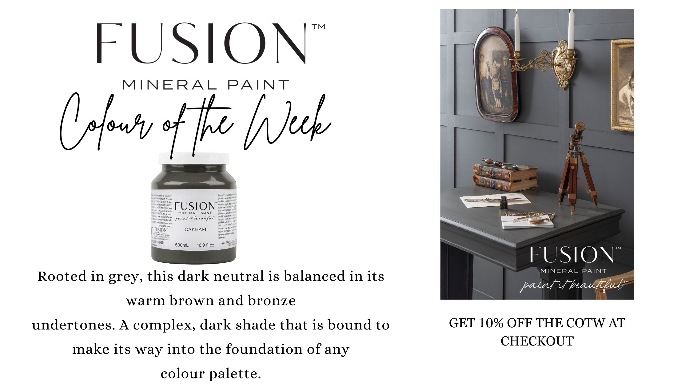 An array of colours to chose from, built in primer and top coat, no harmful VOC's. Get started with Fusion Mineral Paint today!