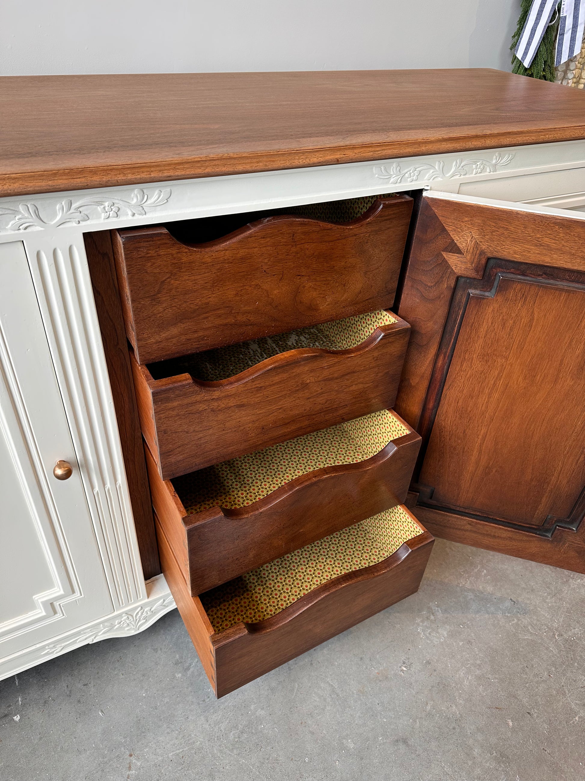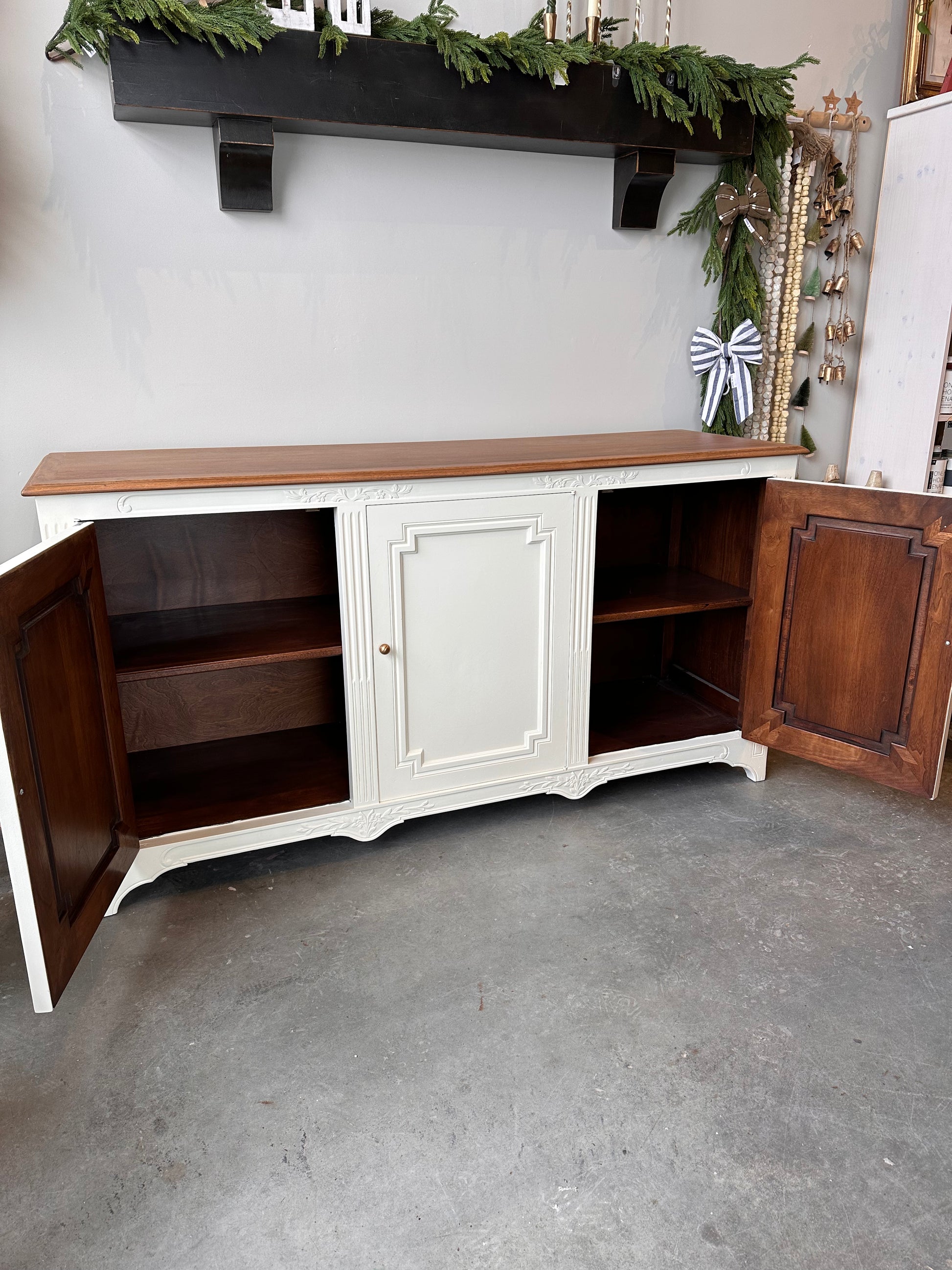 This might be the perfect statement piece for your dining room! The combination of antique white, walnut, and carved floral details is stunning. It's a great piece for those who want to add a vintage or farmhouse twist to their modern space.