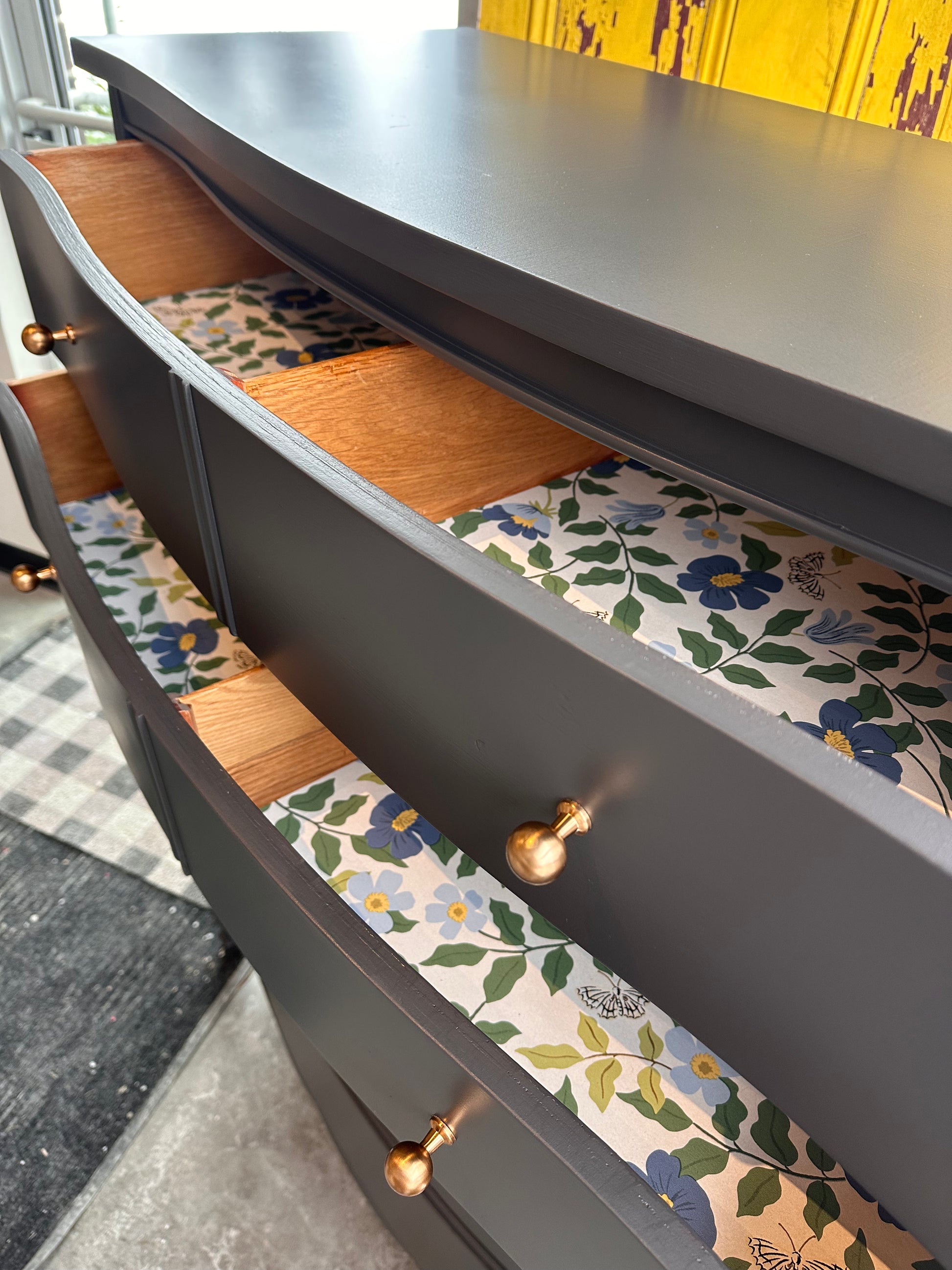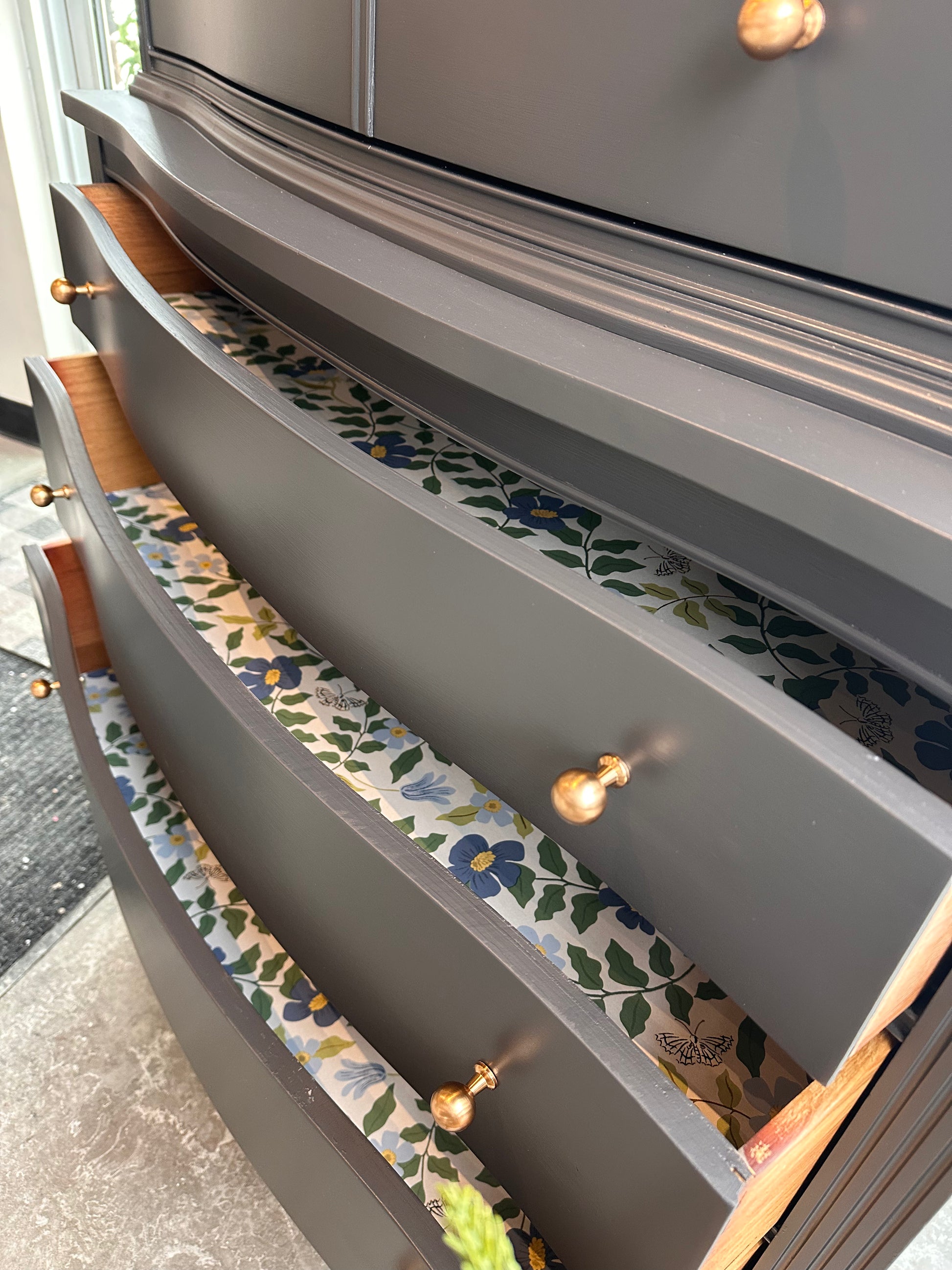 Beautiful refinished tall 5 drawers line dresser in the colour Armory by Sherwin Williams. New knobs and wallpaper lined drawers, that aren’t fussy to close. A lovely statement piece in this cool soft black.