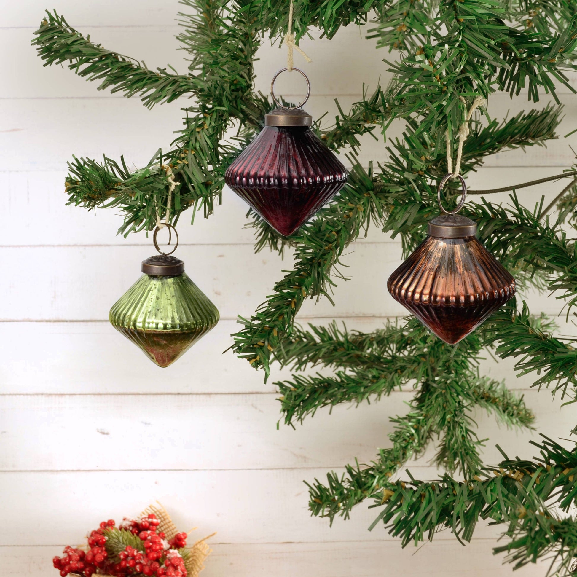 A captivating trio crafted from rich green, burgundy, and bronze glass. These exquisite ornaments feature diamond-shaped designs