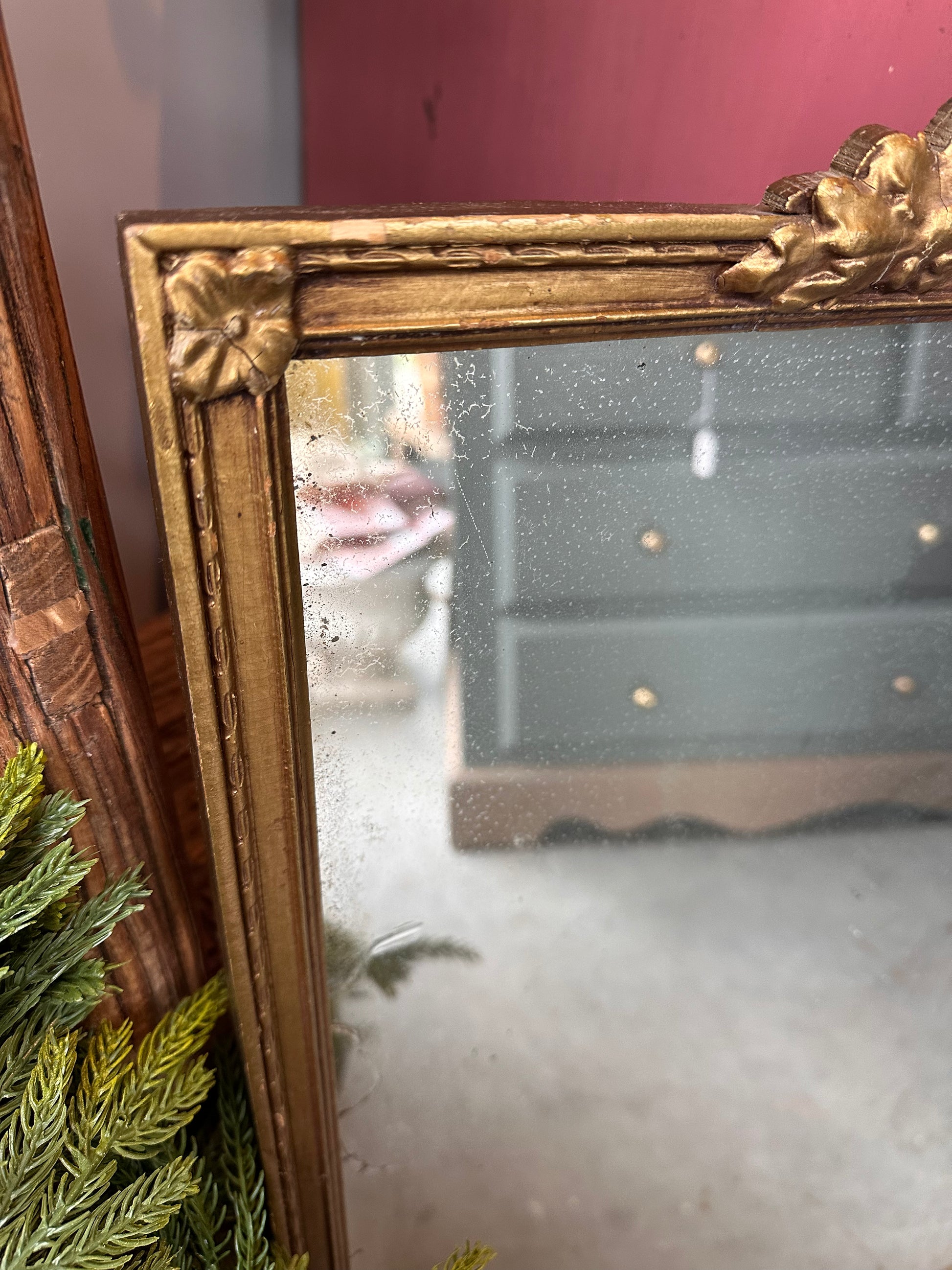 Wood frame painted in a vintage gold. Mirror has a patina wear to it.
